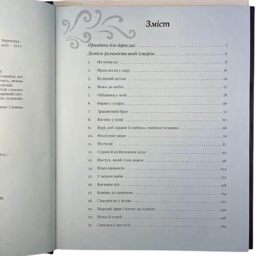 «Біблія в історіях» — книга, що оживає на кожній сторінці! Тут стародавні біблійні події перетворюються на захопливі оповіді, які легко слухати і ще легше розповідати дітям. Кожна історія звучить, немов маленька пригода, повна відкриттів і запитань, що ведуть до роздумів.