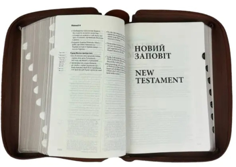 Паралельна Українсько-Англійська Біблія Коричнева на застібці, розмір 16 х 24 см / Ukrainian English Parallel Bible