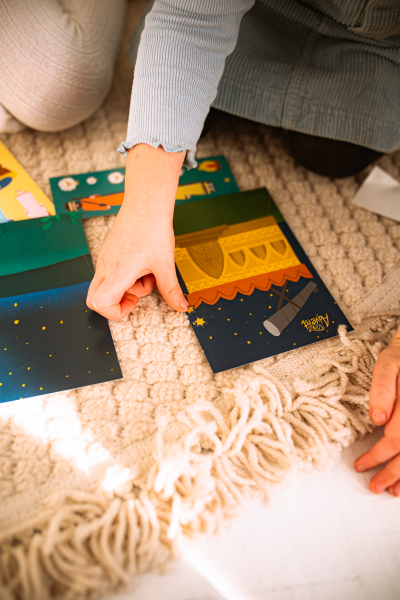 - 4 набори листівок: кожен набір містить різдвяні сцени, які можна прикрашати наліпками.