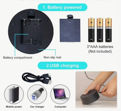 Світильник працює від мережі, 3-х батарейок АА, комп'ютера, power bank.