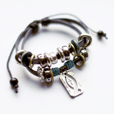 3. Кожа, металлические бусы, бирюзовый шнур.