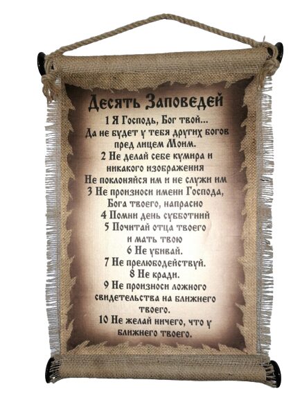 Красивое настенное панно свиток для любителей "старины" со Священными местами писания. Выполненное из мешковины и плотной бумаги с особым нанесением текста, по краям панно скрепляется деревянными палочками.