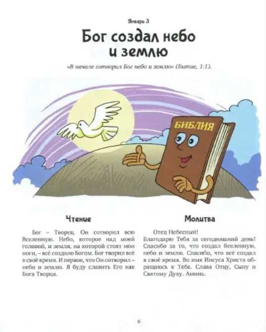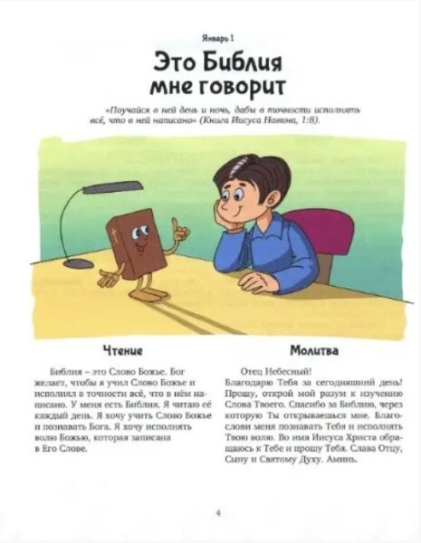 У книзі містяться короткі тексти для щоденного читання та молитви на 365 днів, які допоможуть дітям пізнавати незмінні істини Слова Божого. Щодня приділяючи час Господу і молитві, читаючи і запам'ятовуючи напам'ять вірші зі Святого Письма, дитина дізнається біблійні цінності і навчиться найважливішого – любити Бога.