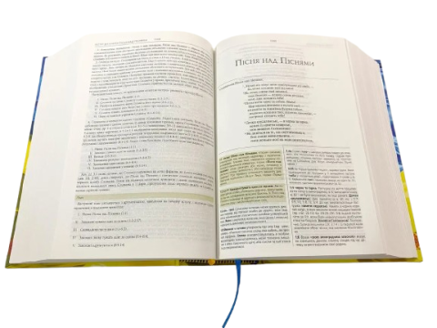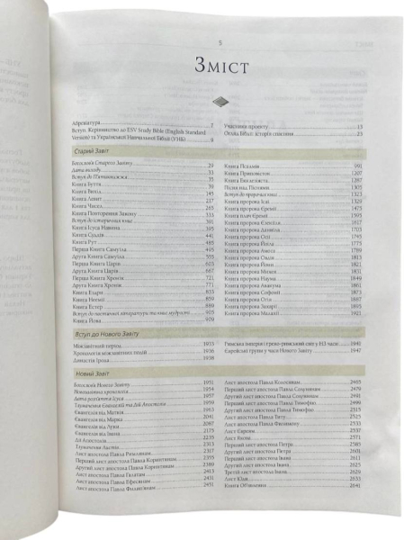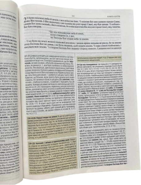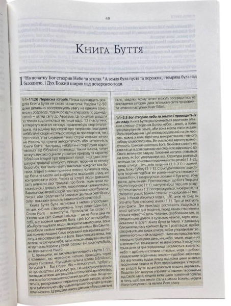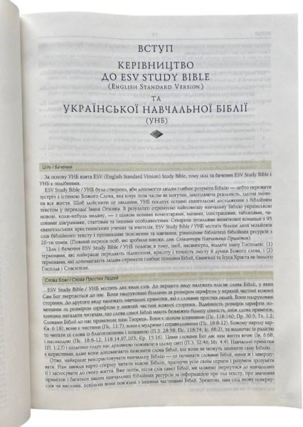 Украïнська Навчальна Бiблiя містить бiблiйний текст в перекладi Івана Огiєнка та дoпoмiжний матерiал English Standard Version Study Bible. ESV Study Bible - одне з найкращих видань на сьогодні.