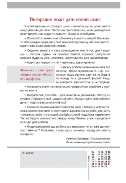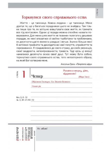 Влучні цитати, цікава інформація, коментарі до недільних читань Святого Письма богослова та журналіста Василя Калити — усе це в зручному календарі-щоденнику з твердим чоловічим характером.