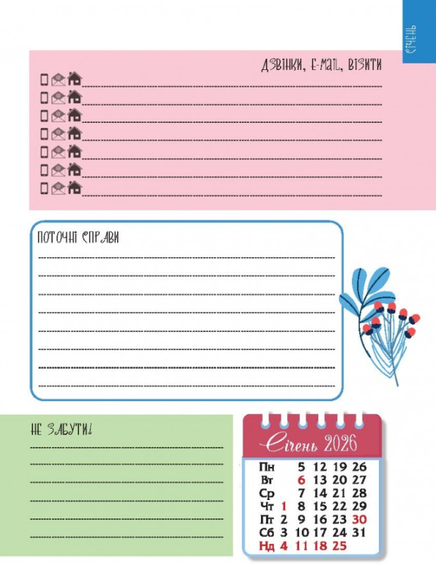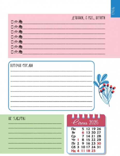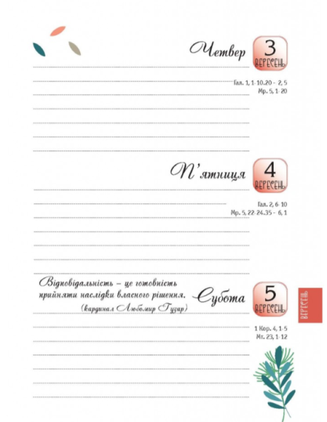 Цей календар-щоденник – справжній помічник для сучасної активної жінки-християнки. На його сторінках ти зможеш робити нотатки, письмово впорядковувати свої справи та вести приватні записи. Також знайдеш тут щоденні читання зі Святого Письма, оригінальні кулінарні рецепти, короткі роздуми і корисні поради.