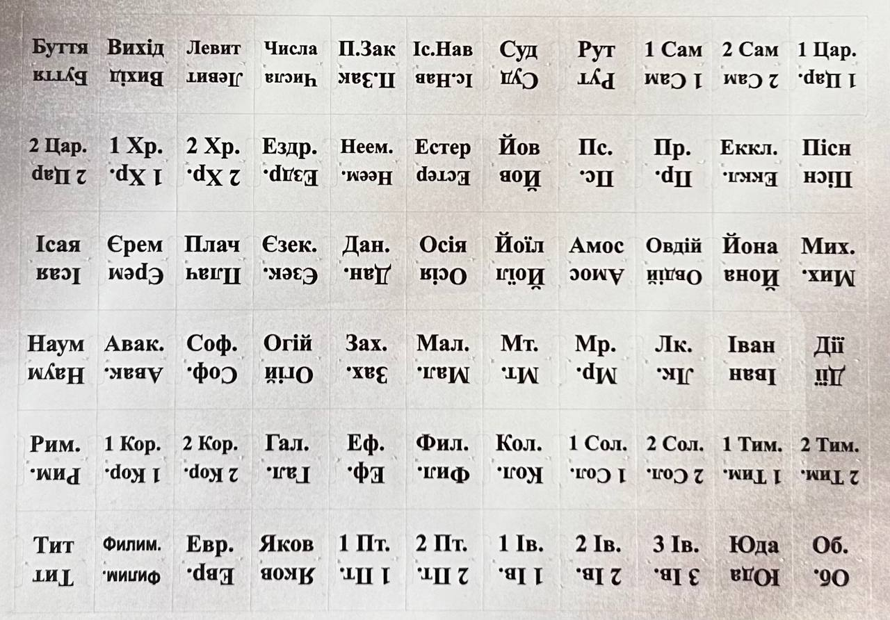 Назви 66 книг Біблії і прорізано плотером