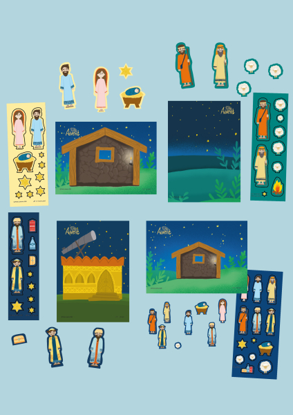 - Наліпки: включають персонажів Різдвяної історії (Марію, Йосифа, ангелів, пастухів та інших), а також різні різдвяні символи.