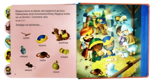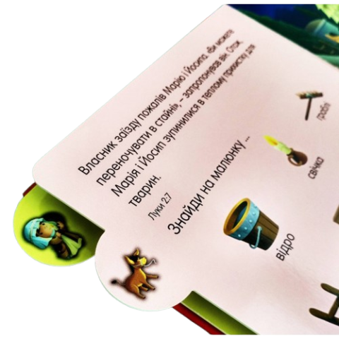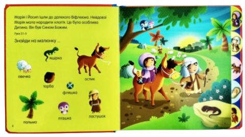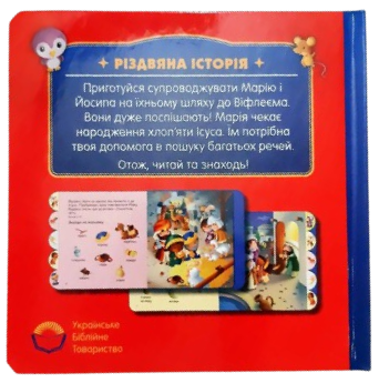 Ця книжка не тільки розповість цю різдвяну історію, але і яскравими ілюстраціями покаже, як це було. Тому автори закликають малюків приготуватися супроводжувати Марію і Йосипа на їхньому шляху до Віфлеєма та виконати кілька цікавих завдань.