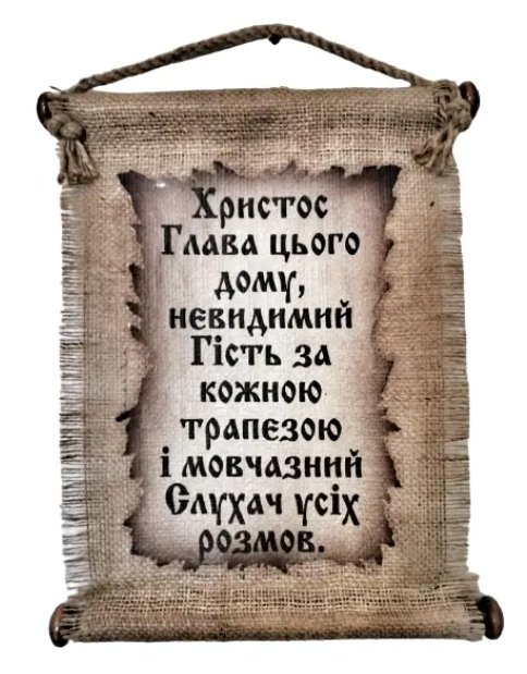Красиве настінне панно сувій для любителів "старовини" зі Священними місцями писання. Виконане з мішковини і щільного паперу з особливим нанесенням тексту, по краях панно скріплюється дерев'яними паличками.