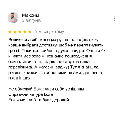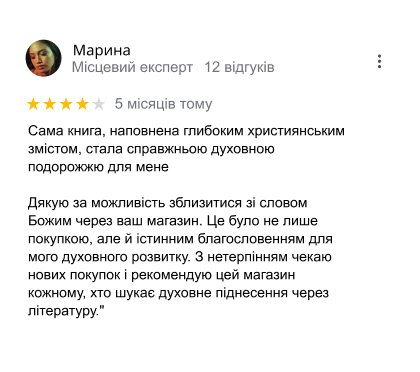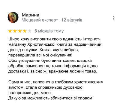 Християнський інтернет-магазин книги працює з 2006 року і за цей час ми придбали багато друзів серед покупців, які неодноразово робили у нас покупки та залишилися задоволені. Наш магазин співпрацює з відомими християнськими видавництвами та тому наша продукція доступна за ціною. А також у нас ви можете завжди придбати подарункові та дитячі Біблії та бути в курсі всіх новинок. І найцікавіше, у нас діє система знижок, яка розраховується індивідуально після оформлення замовлення.