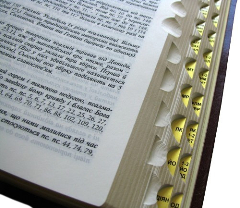 - На початку Книги - загальні відомості про Біблію, в кінці - показники: найважливіші історичні дати, міри та ваги, Євангелії та Апостоли, інше...