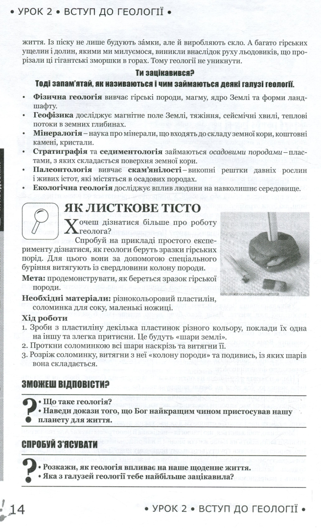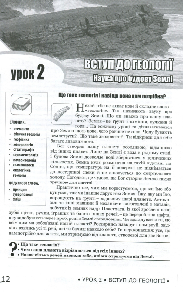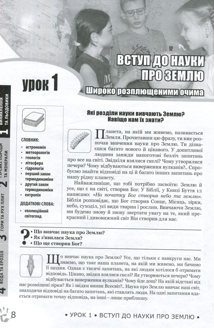 У цьому підручнику йдеться про те, що Бог задумав і створив Землю спеціально для нашого життя. Ви дізнаєтесь про скелі, вулкани, землетруси й льодовики, зрозумієш, як Всесвітній потоп змінив поверхню Землі, коли був льодовиковий період і чому скам'янілості підтверджують біблійну історію.