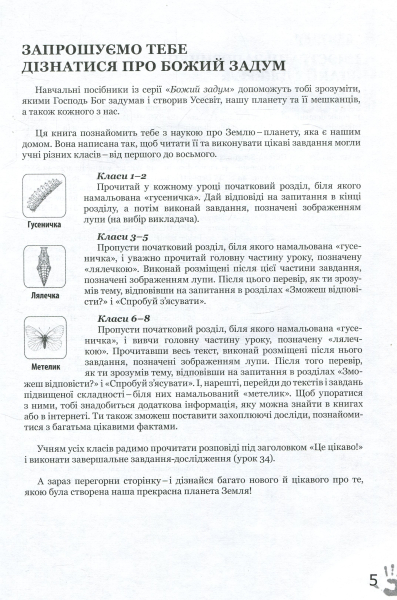 Особливість серії підручників "Божий задум" у тому, що кожна книга адресована школярам різного віку. По суті, це - відновлення традицій змішаної системи навчання, коли старші учні можуть допомагати молод-шим, закріплюючи при цьому вивчений матеріал.
