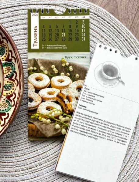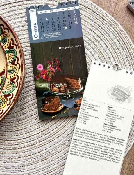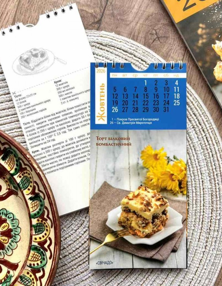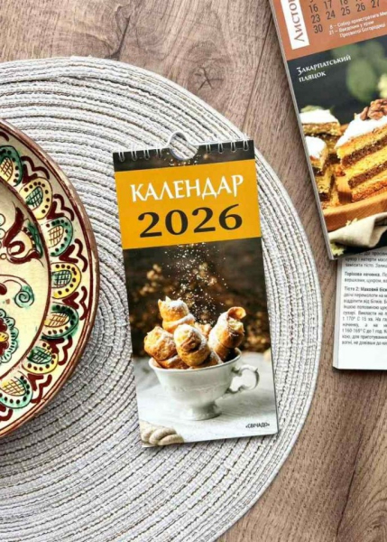 Перекидний календар на 2026 рік з барвистими листівками та кулінарними рецептами. Зручний у користуванні - його можна повісити на стіну, а можна просто поставити на стіл.