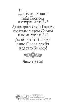 Оборот: Да благословит тебя Господь и сохранит тебя! Да призрит на тебя Господь светлым лицом Своим и помилует тебя! Да обратит Господь лицо Свое на тебя и даст тебе мир! Числа 6:24-26 размер: 10 х 15,5 см