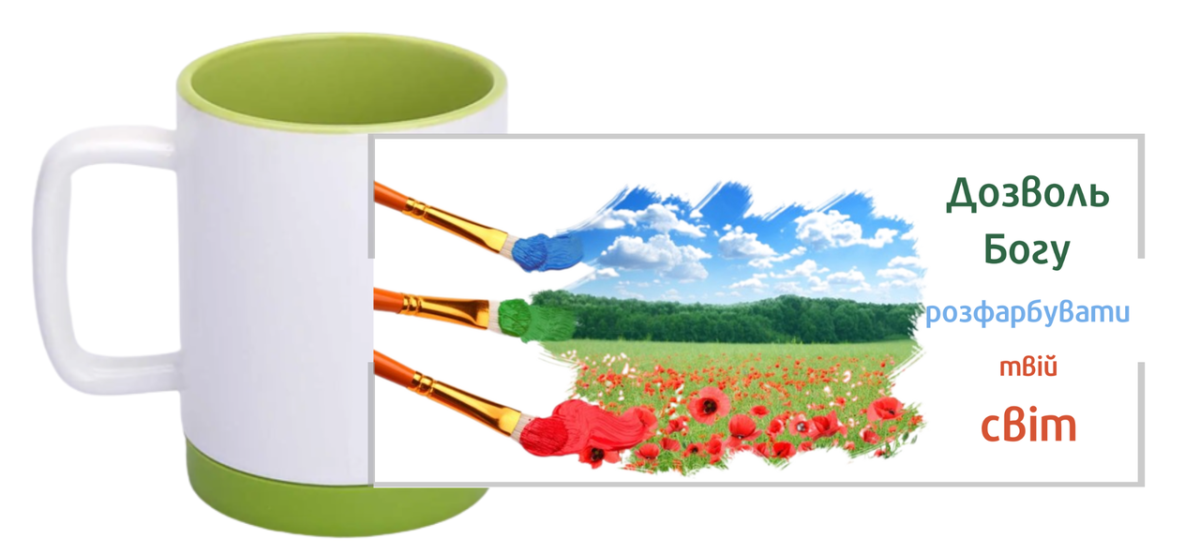 Чашка "Позволь Богу разукрасить твой мир" с силиконовым ободком цветная внутри / на украинском салатовая