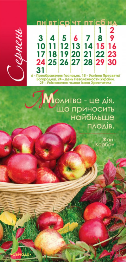 У календарі виділені основні державні та церковні свята. Кожен місяць - це окрема листівка, яку потім можна відрізати і написати комусь гарні побажання чи використати як закладку до книжки.