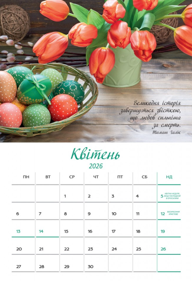 Естетичний великоформатний календар, оформлений світлинами квіткових композицій та цитатами з псалмів.